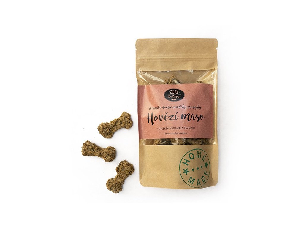 Tyto křupavé domácí pamlsky kombinují to nejlepší: čerstvé šťavnaté hovězí maso, voňavou bazalku a bezlepkovou ovesnou mouku. Vše bez chemie, bez konzervantů a umělých barviv – zkrátka láska v každém soustu!